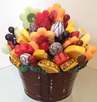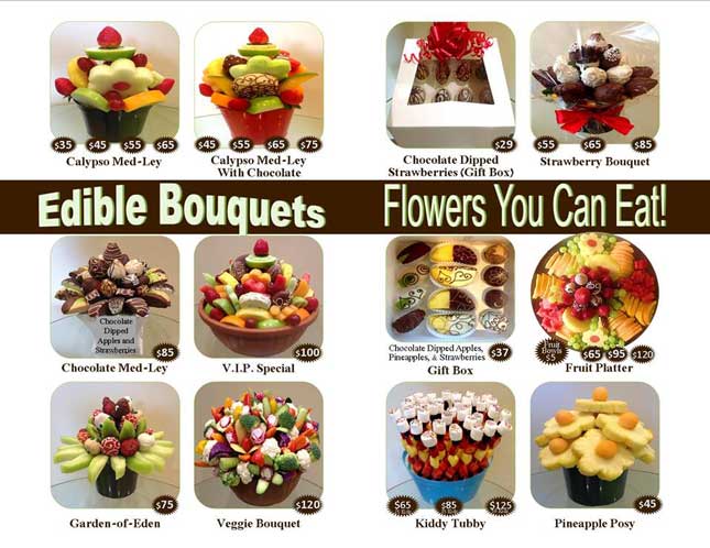 FLOWERS YOU CAN EAT! Edible Bouquets is a specialty service we provide with fresh fruit arrangements combining the concept of fresh fruit baskets with our floral design business. The aim of our service is to create stunning fruit bouquets that will make any social event special. Our fruit arrangements are absolutely delicious, with a unique style and taste to tempt your taste buds. |